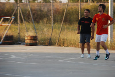 El primero enfrentaba a solteras contra casadas. Las solteras, de azul, las casadas de rojo. Ganaron las primeras, pero la portera de las casadas, Elena, hizo grandes paradas.